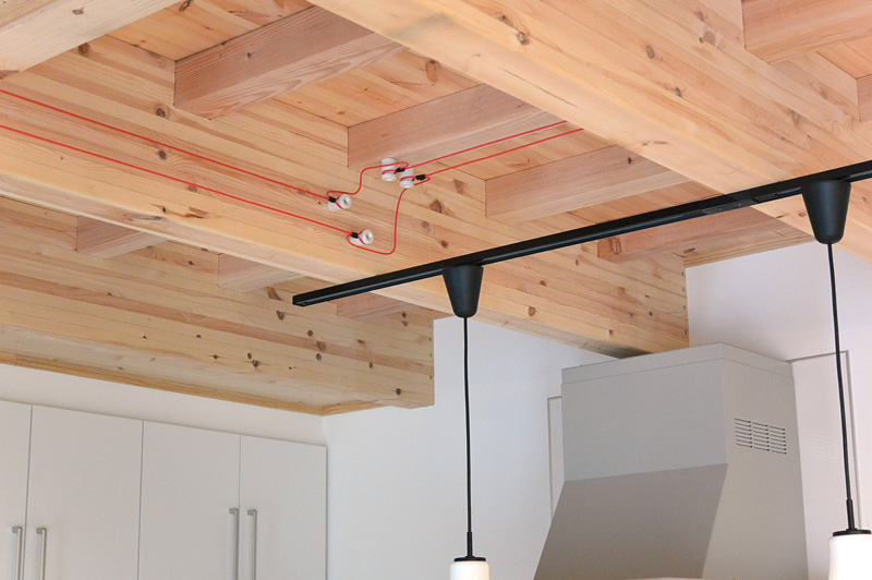 30mm厚の無垢の床板、天井は表わしの梁に2階床板の表わし。